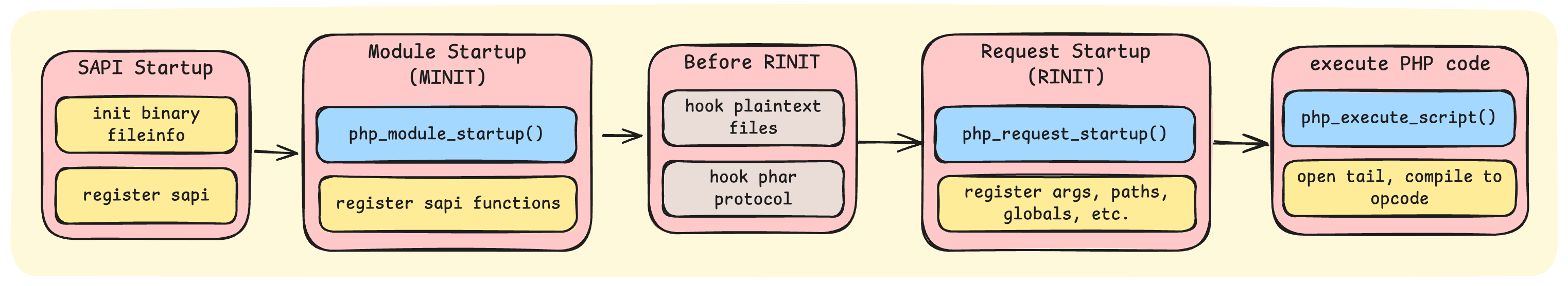 |--------------------------------|--------------------------------------|When we execute ./myapp, the operating system loads the entire file into memory and begins executing the micro.sfx portion of the code. micro SAPI detects that there's PHP code or a Phar file at the end of the file and passes it as input to the built-in PHP interpreter for execution.